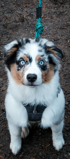Fisher is a Blue Merle Australian Shepherd.